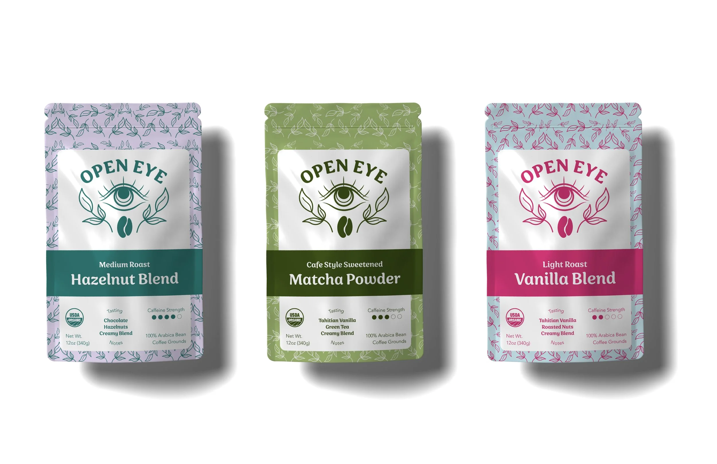 Open Eye is a fictional coffee and tea company offering a combination of classic and totally unique coffee and tea blends that are certified organic. Open Eye is bold, playful, and modern, and they are taking the coffee and tea aisle by storm.